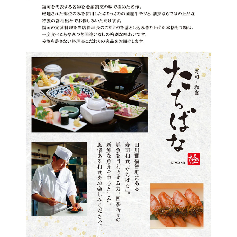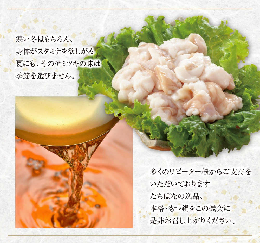 多くのリピーター様からご支持をいただいておりますたちばなの逸品、極みもつ鍋をこの機会に是非お召し上がりください。
