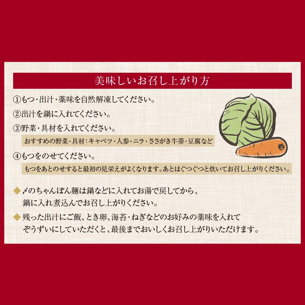 特製出汁330cc×4袋 厳選牛もつ160g×4袋 全粒粉入りチャンポン麺200g×2玉 赤唐辛子・にんにくチップ